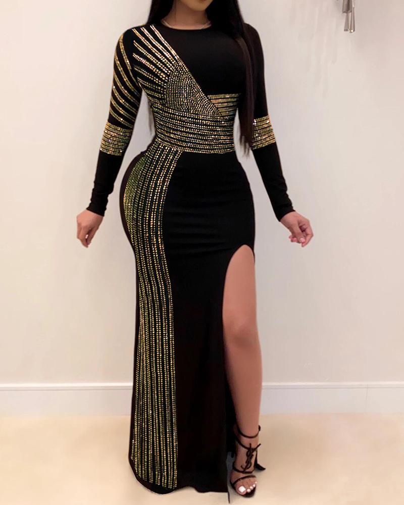 Hot Rhinestone Slit Maxi Dress